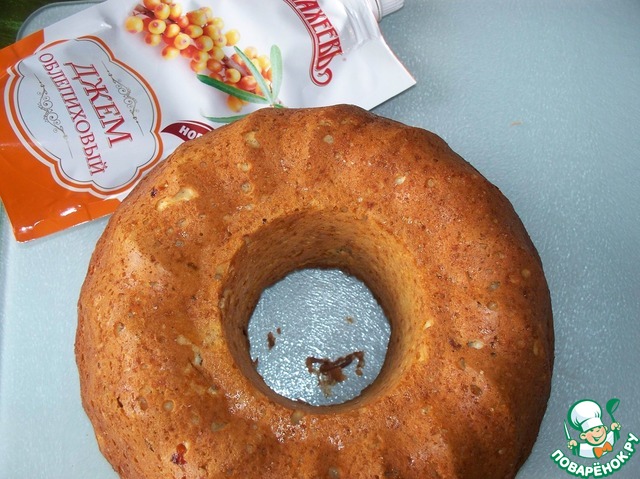 Вот такой у нас получился красавец. Пока кекс еще горячий, обмазываем его джемом, при этом джем отлично впитывается.