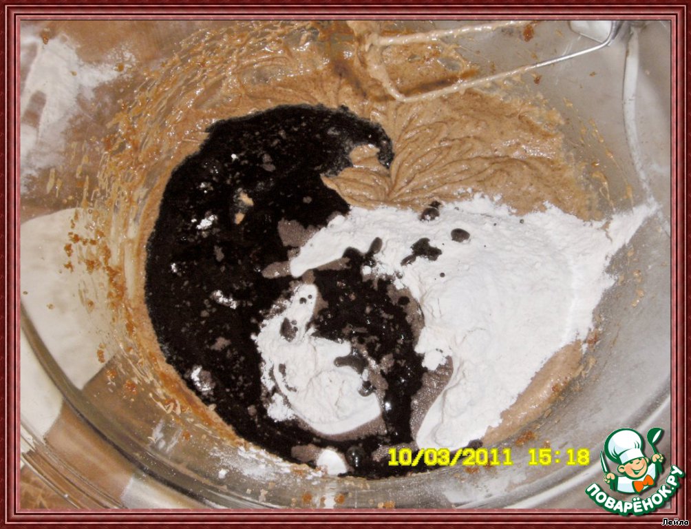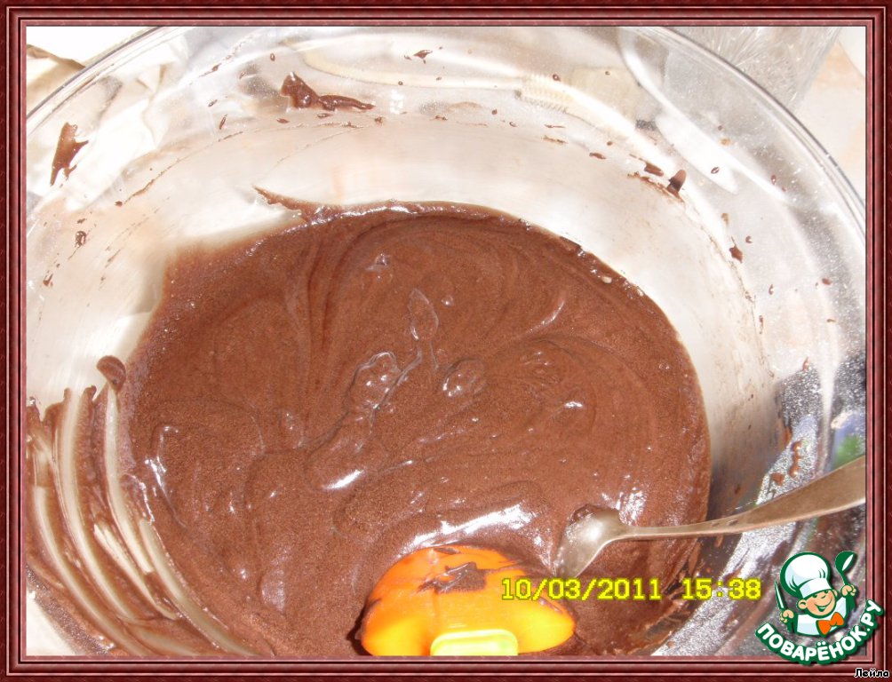 чередуя с горячей жидкостью с какао (начать и закончить с мучной массы).