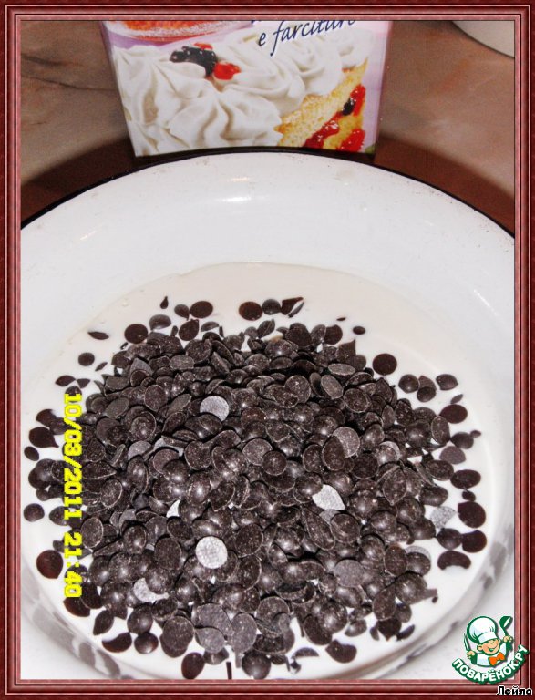 Довести до кипения сливки, но не кипятить. Залить ими шоколадные чипсы и оставить, не мешая, на 5 минут. Перемешать хорошо до однородной массы,