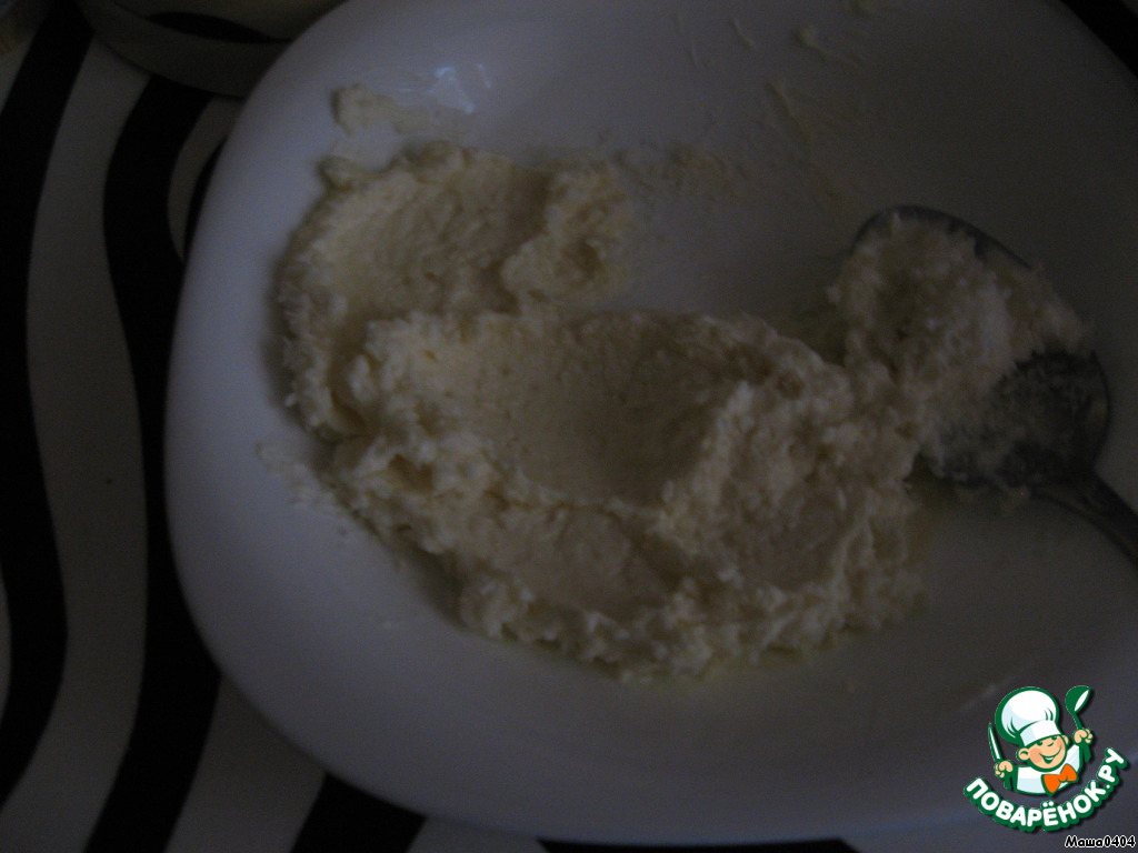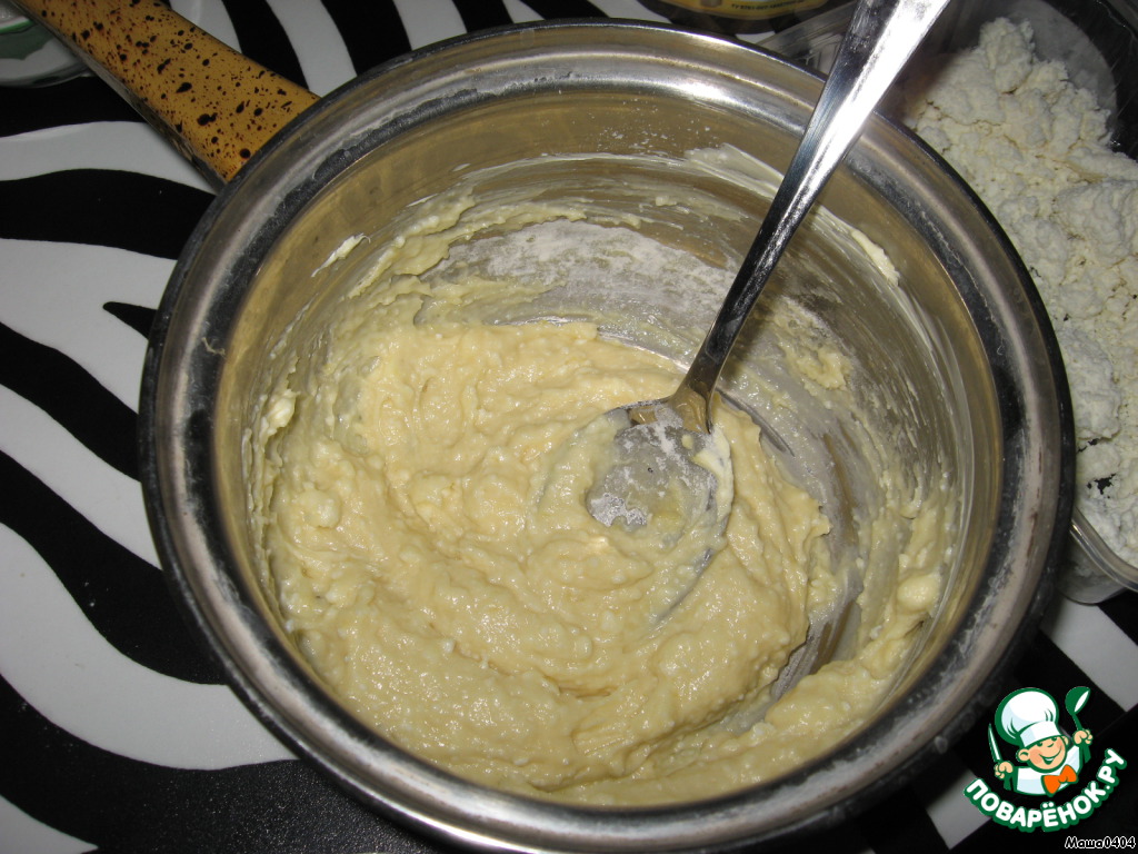 Растопите маргарин, смешайте его с мукой, яйцом, сахаром и творогом.