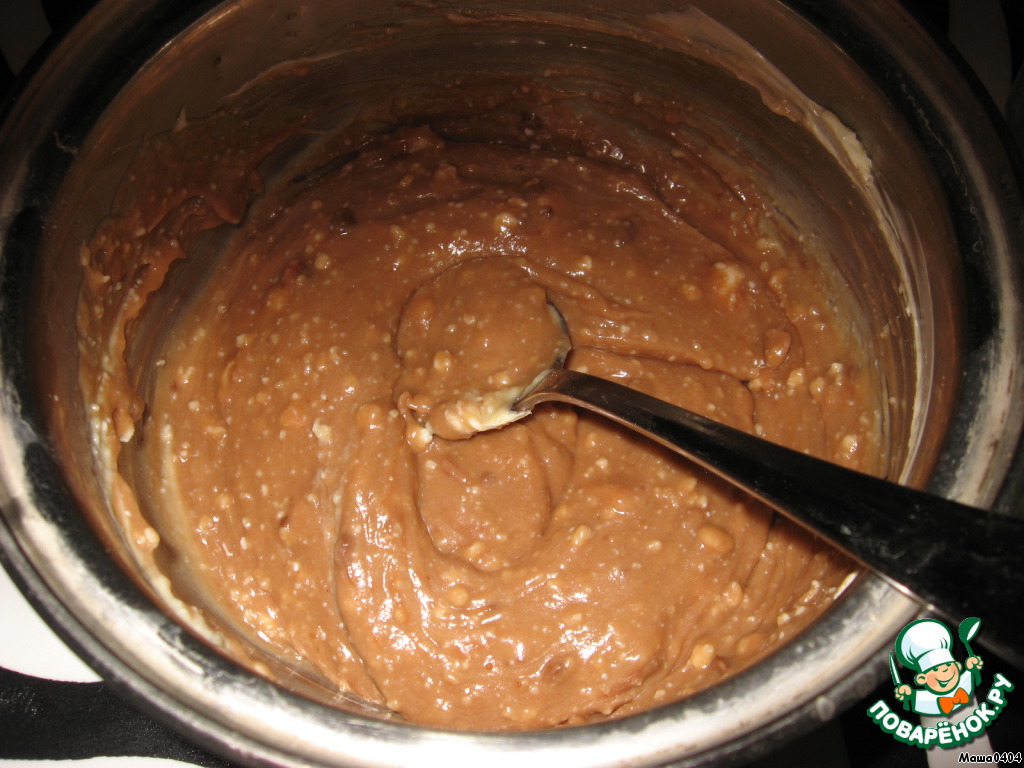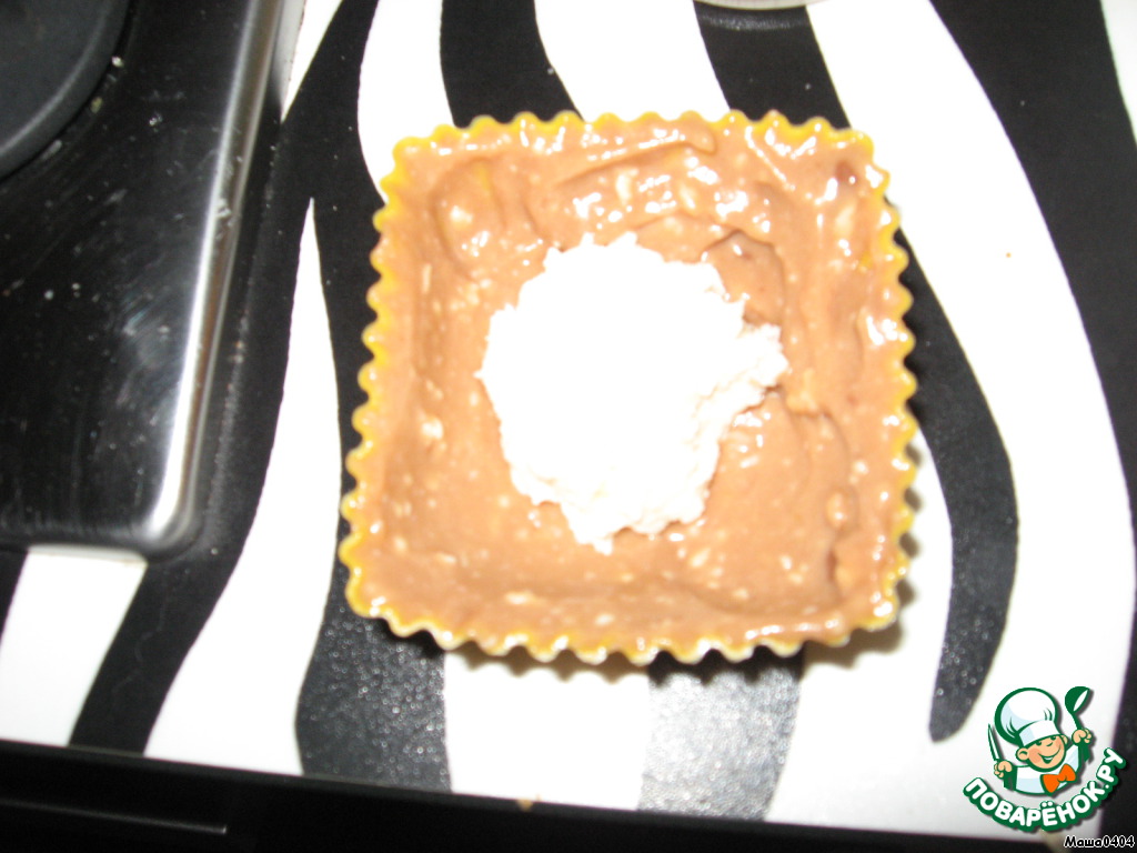 Собираем кекс. Края формы обмазываем шоколадным тестом, внутрь кладем начинку.
