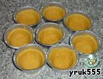 Разделить тесто на 15-20 шариков. Раскатать их в блинчик и выложить в формы для кексов.