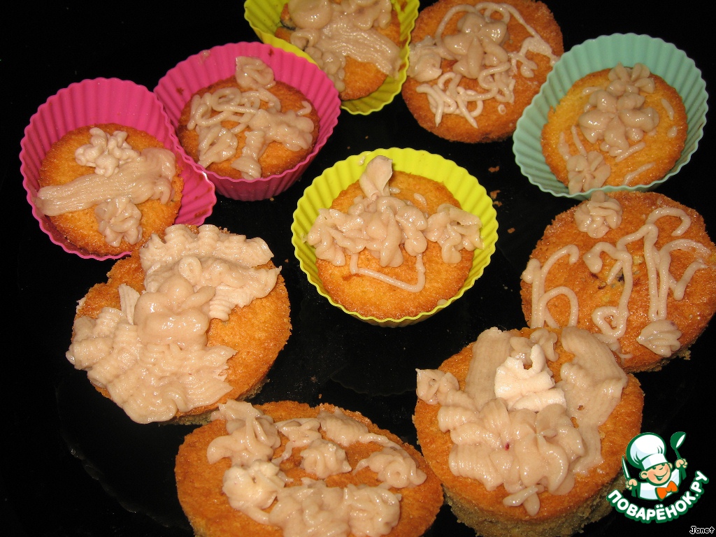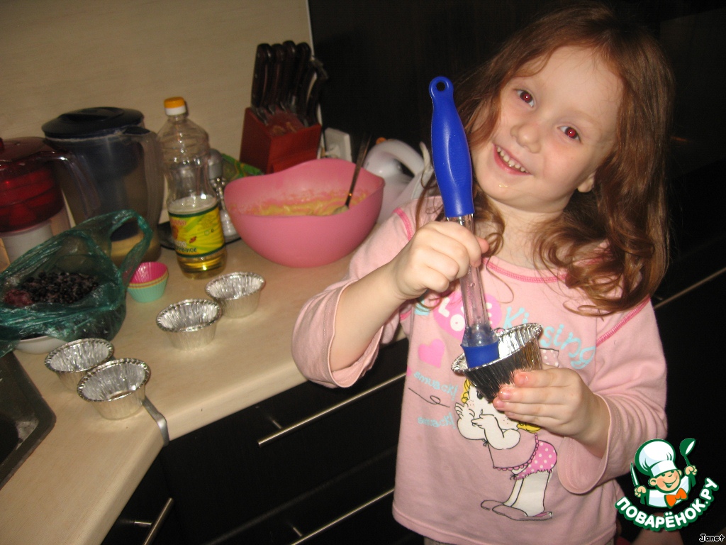 Формочки смазать растительным рафинированным маслом. Очень весёлое занятие! У нас получилось 10 больших и 6 маленьких кексиков.
