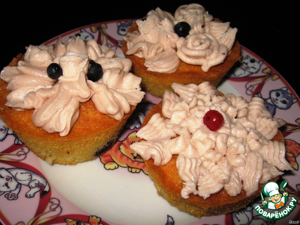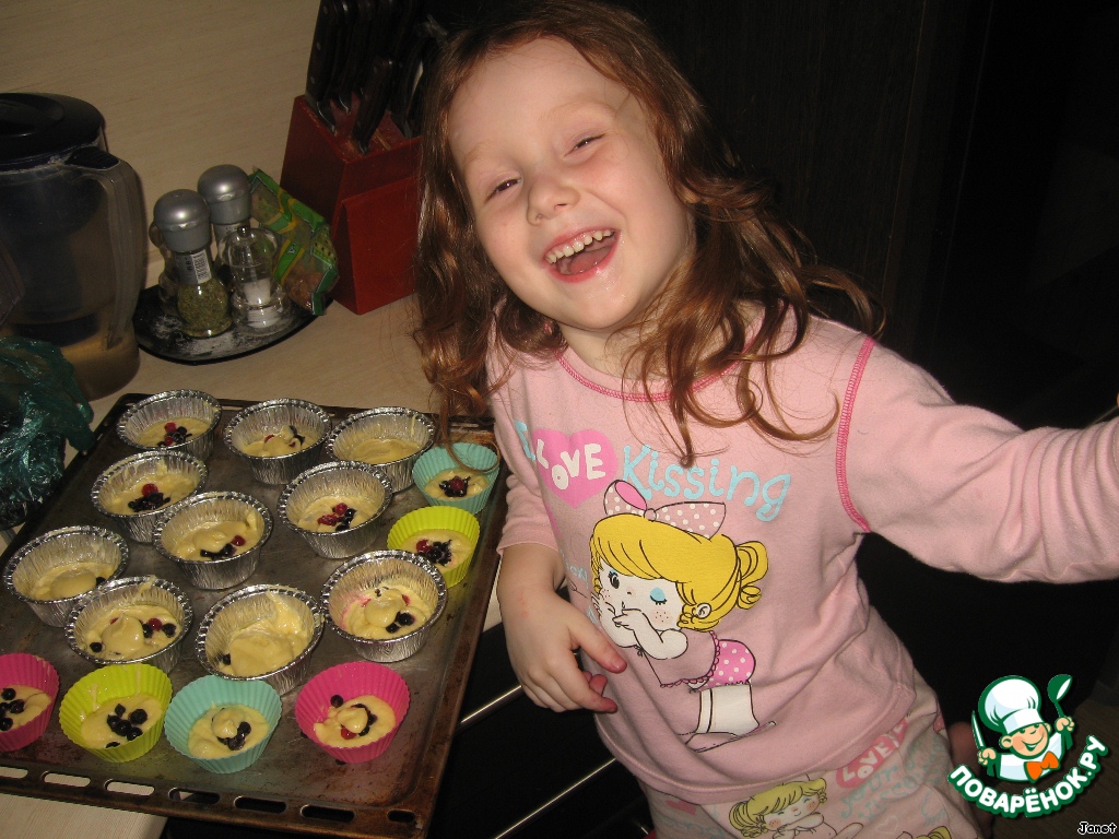 Разложить тесто по формочкам на половину объёма. Сверху вдавить в тесто 5-6 ягодок красной или чёрной смородины.