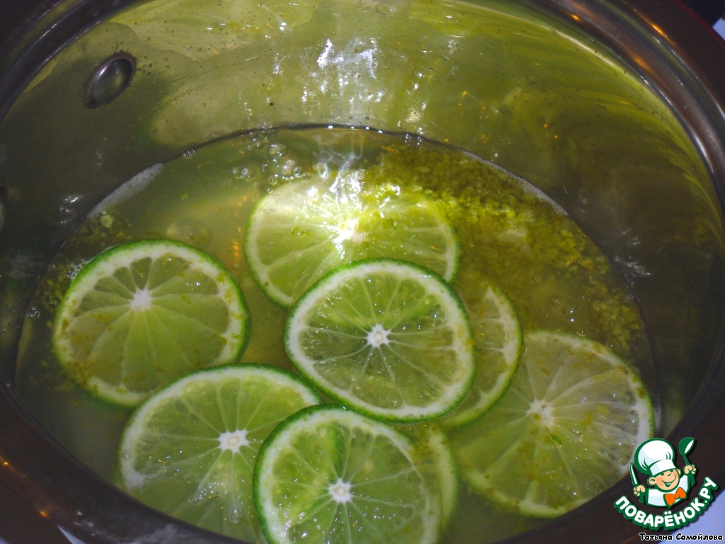 Один лайм нарезать кружочками, с двух натереть на терке цедру и выжать сок. Вскипятить в кастрюле 120 мл воды с тремя ложками коричневого сахара и лаймовым соком, добавить в сироп цедру и кружочки лайма.