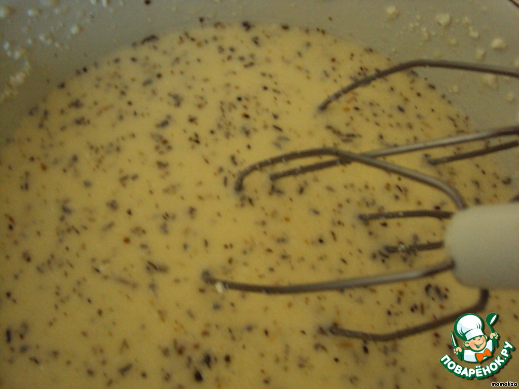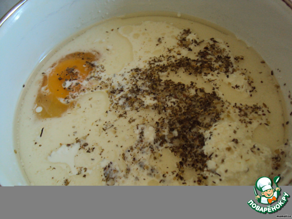 В отдельной посуде смешать жидкие составляющие: молоко, масло, яйцо, творог и сыр. Туда же добавить специи.