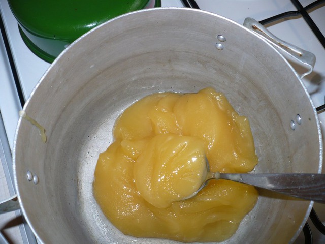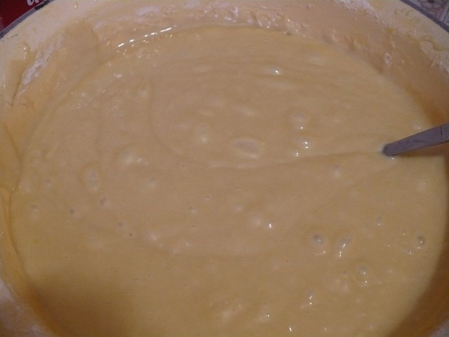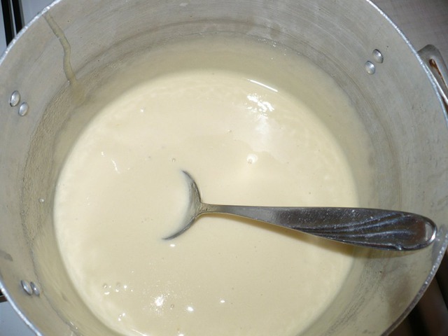 В другой посуде на маленьком огне распускаем мед, и добавляем другую половину соды(0, 5 ч. л. ), интенсивно помешивает, что бы мед побелел и вырос в объеме. Далее соединяем с предыдущей массой, мешаем (я вымешиваю венчиком – блендером), добавляем муку, растительное масло.