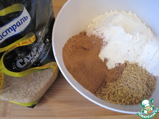 Орехи измельчим в блендере. Смешаем муку, разрыхлитель, какао-порошок и измельчённые орехи.
