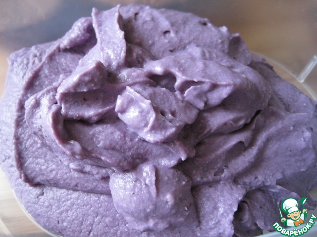 Для черничного крема: чернику разморозим и протрём через сито. Взобьём миксером все ингредиенты до плотной массы, которая хорошо держит форму. Если не добавлять маршмеллоу-крем, то по вкусу можно добавить ещё сахарной пудры.
