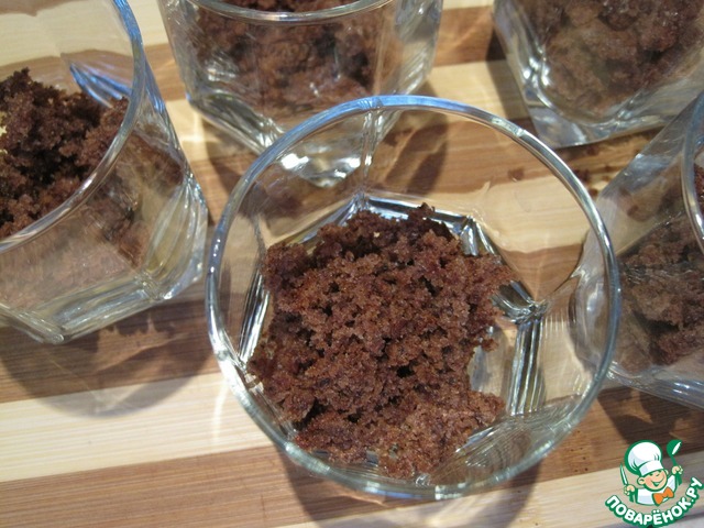 Удалённые серединки я измельчила в крошку и приготовила ещё один десерт-трайфл в стаканах. Для этого я слоями выложила бисквитные крошки, два вида крема и немного взбитых сливок.