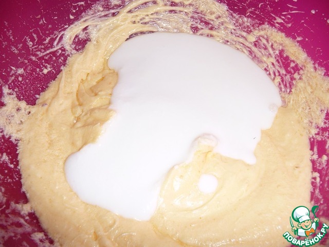 В полученную массу влить кефир и взбить.