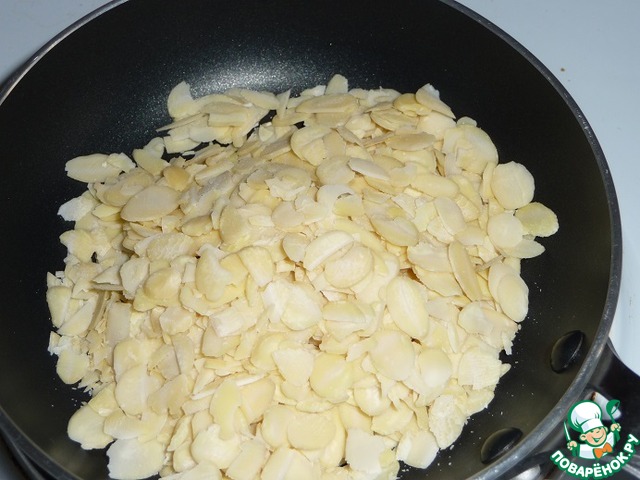 Миндаль подсушить на разогретой сковороде.