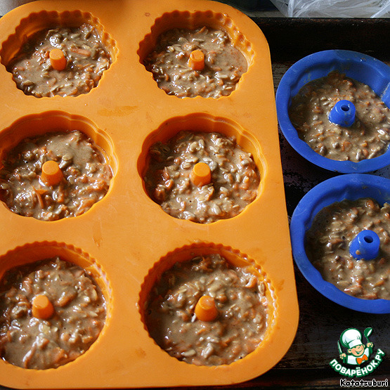 У меня силиконовые формы - их не надо смазывать перед выпечкой. Заполнить на треть...