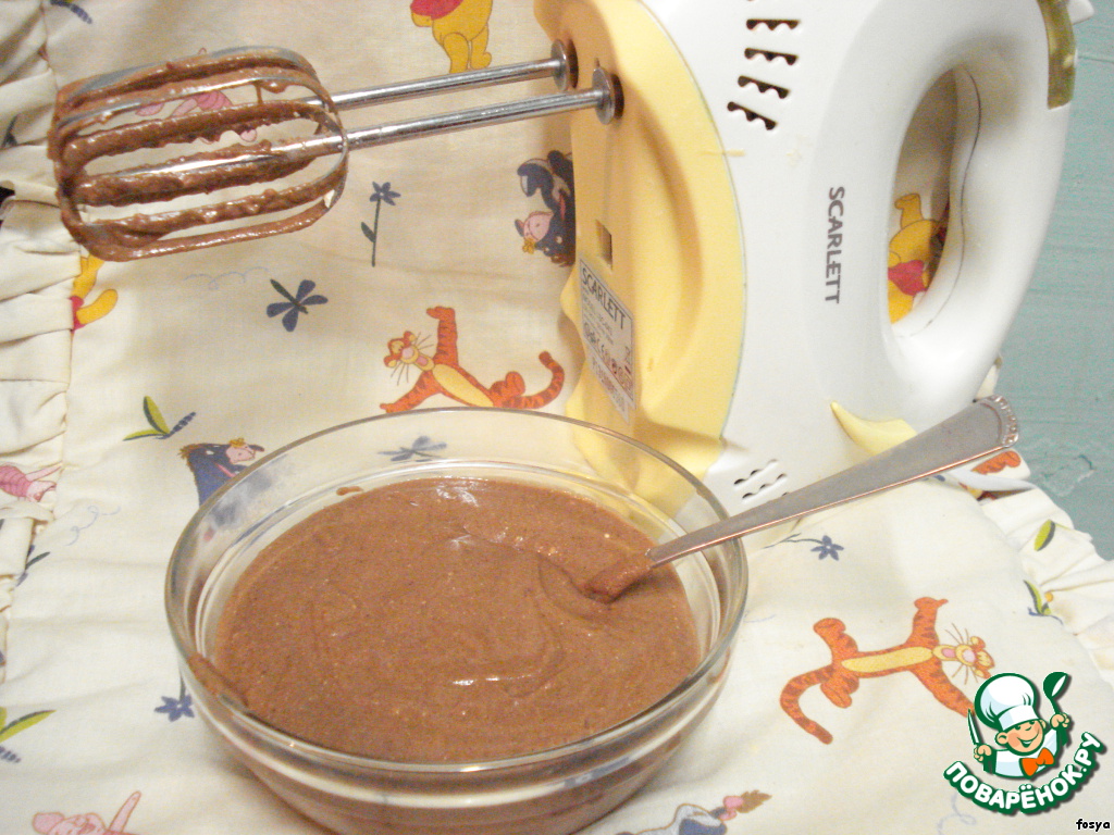Смешать все ингредиенты (кроме вишни и ирисок) вместе в той очередности, как они написаны в ингредиентах. Тесто по густоте, как сметана.