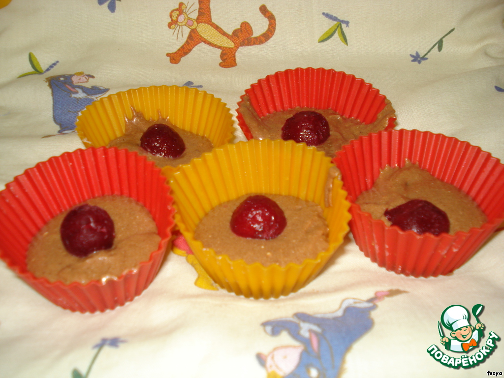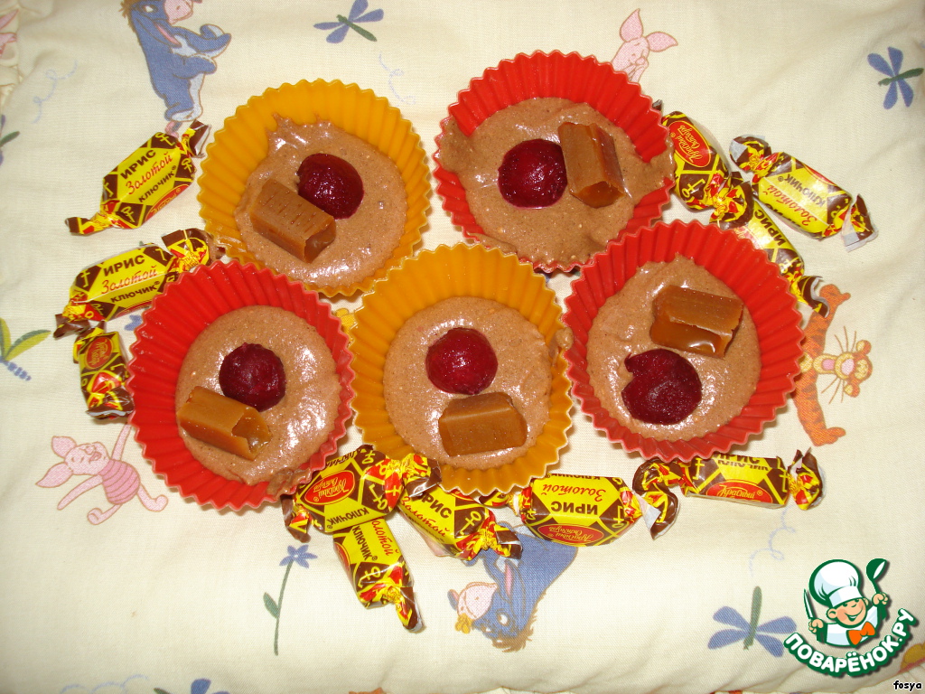 Выпекать при температуре 170 градусов 30 минут, ориентируйтесь на свою духовку. Внутри кексы заполнены начинкой из ириски и вишни, ирис больше не застывает.