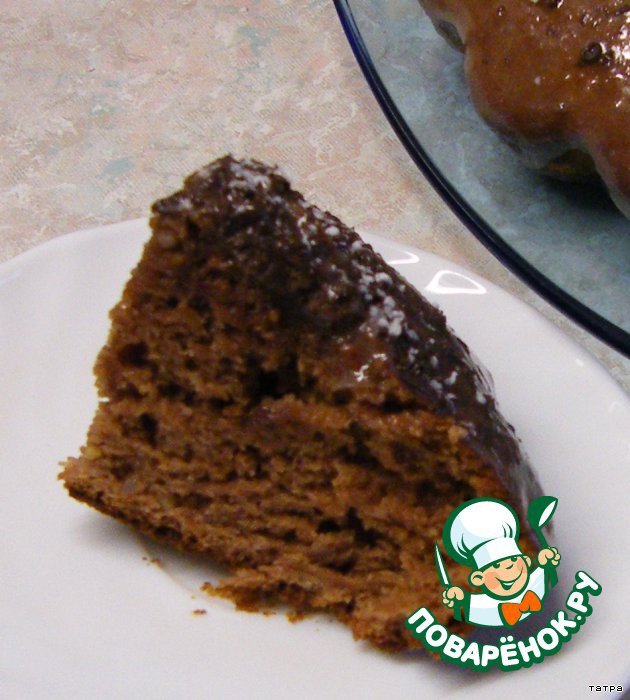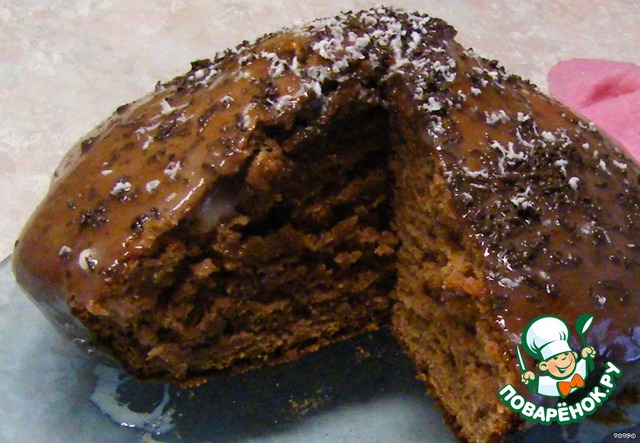 Я его немножко украсила.сварила глазурь на водяной бане:шоколад+мед+молоко.Отлично застывает,сверху посыпала немножко тертым белым и черным шоколадом.