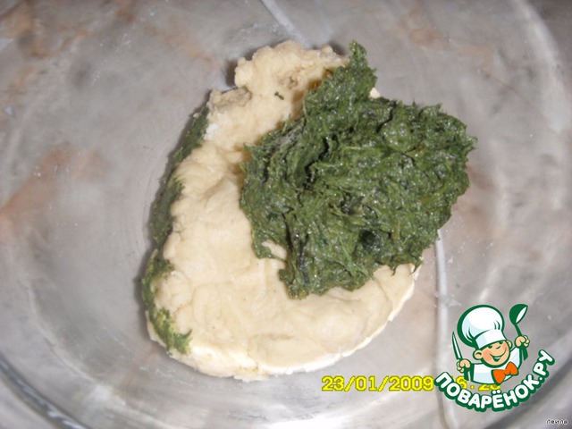 Добавить остывшую шпинатную массу в тесто, перемешать