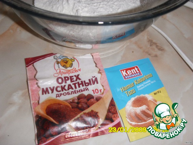 Просеять муку, добавить соль, разрыхлитель, мускатный орех