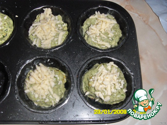 Формочки смазать маслом, заполнить их тестом примерно на 2/3 объема. Присыпать оставшимся сыром и запечь в разогретой до 200*С духовке 25 мин.