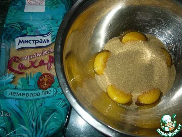 В миску кладём желтки, добавляем сахар тростниковый ТМ"Мистраль"