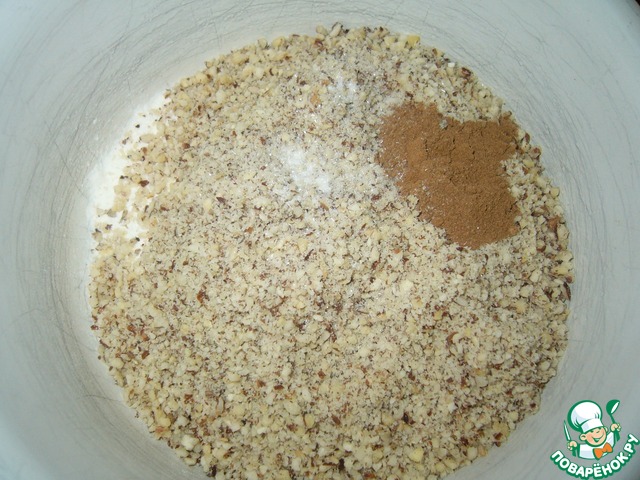 Смешать в отдельной миске муку,100г орехов, корицу, ванилин
