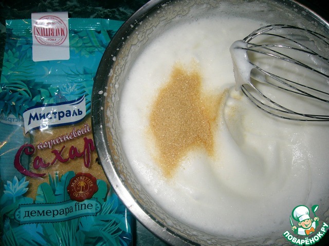 Взбить белки до состояния пены, после чего, продолжая взбивать, постепенно всыпать сахар тростниковый ТМ"Мистраль"