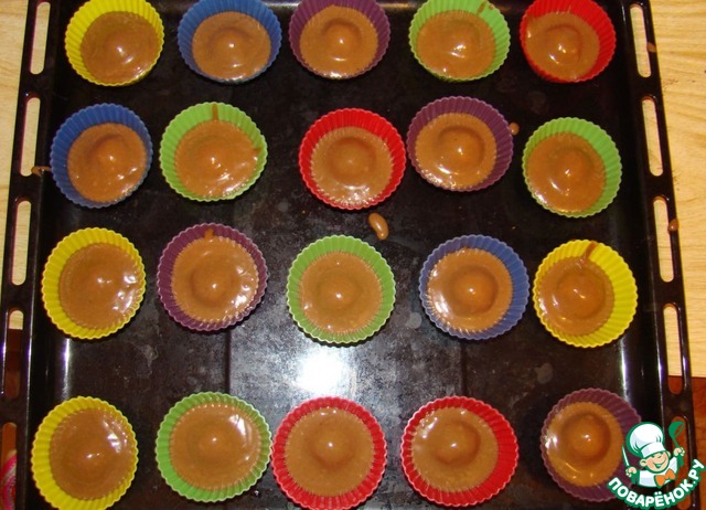 А теперь, приподняв творожный шарик, на дно каждой формочки выливаем половину столовой ложки шоколадного теста, возвращаем на место нашу начинку и поливаем сверху столовой ложкой теста.