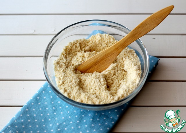 Смешаем все сухие ингредиенты: муку, муку миндальную, соду и пекарский порошок.