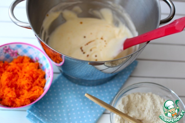 В белковую массу добавить ваниль, и переменно добавляя морковь и сухую смесь, аккуратно вымешать до однородного состояния.