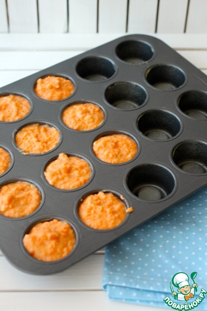Формы для маффинов смазать маслом, у меня вот такая форма уже с выемками в серединке, но можно конечно использовать и обычную.