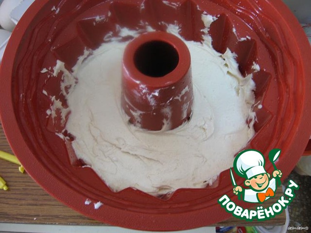 Смазать маслом форму для выпечки и вылить в нее половину теста.
