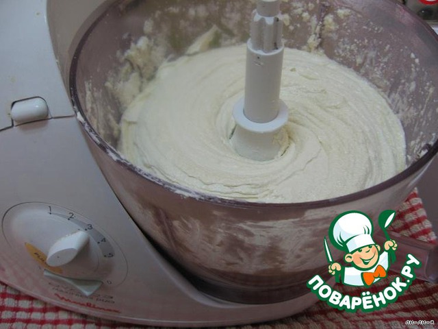 Смешать размягченный маргарин с сахаром и яйцами до получения гладкой массы. Затем добавить постепенно муку, ваниль, сахар и кефир.