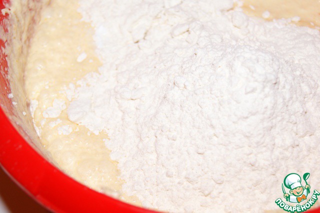 В два приема ввести муку смешанную и просеянную с разрыхлителем, взбивая на 1-й скорости миксера.