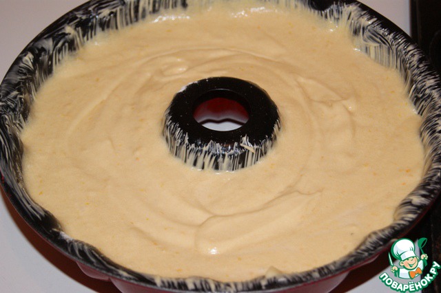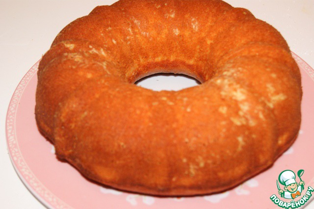 Выпекать в прогретой до 180"С духовке приблизительно 30 минут. Проверить лучинкой. Достать из духовки и сразу же обернуть форму мокрым полотенцем, чтобы кекс легко вышел из нее. Дать полностью остыть.