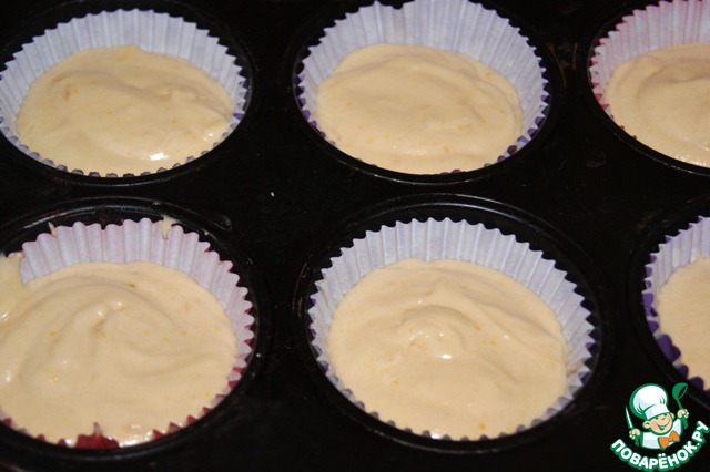 Форму для кексов щедро смазать МАРГАРИНОМ и присыпать мукой и заполнить на 3/4 тестом.