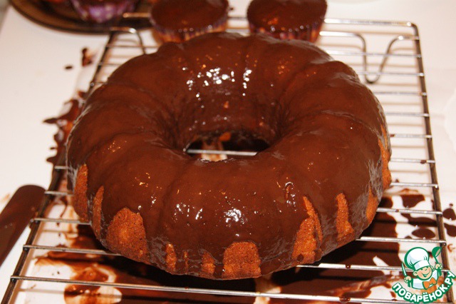 Нагреть сливки до 90"С и растопить в них нарезанный шоколад. Поместить кекс на решетку и покрыть шоколадной глазурью.