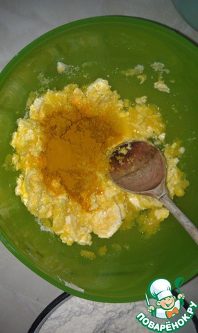 Маргарин, желтки, сахар, куркуму, цедру, лимонный сок и ванилин хорошо перемешать.