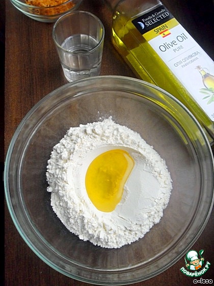 Добавить оливковое масло (можно другое), немного вмешать масло в муку.