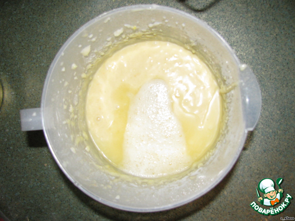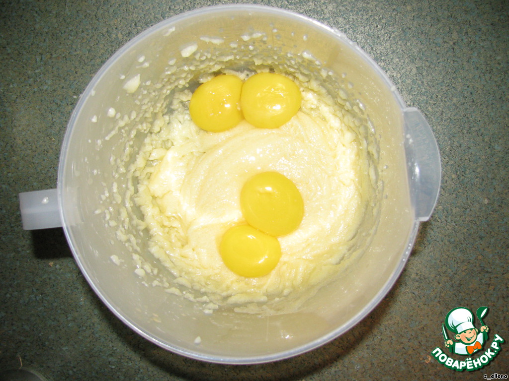 Продолжая взбивать, добавить 4 желтка, цедру, молоко и половину муки