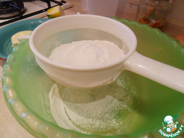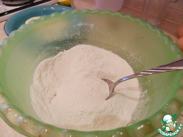 Муку нужно смешать с разрыхлителем и просеять прямо в миску, в которой будем замешивать тесто.