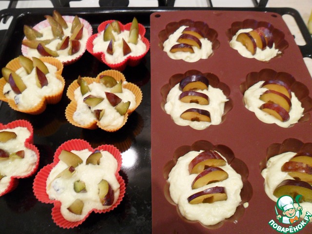 Я для кексов выбрала силиконовые формочки - их не нужно смазывать, если же берете другие - обязательно смажьте сливочным маслом и присыпьте мукой. Выложите на 2/3 формочки теста. Далее нарезаем сливу - можно кружочками,