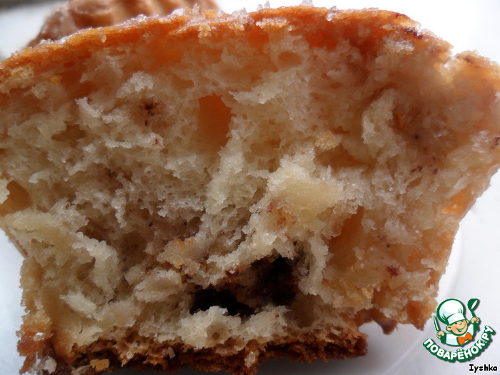 А это в разрезе. Очень мягкое, нежное, пористое и одновременно пружинистое тесто. Я слопала 2 штуки прямо в горячем виде, не удержалась....