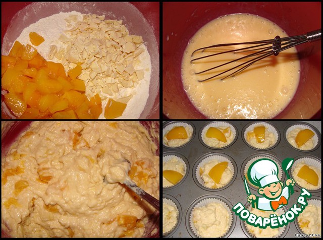 Разлить в формы для маффинов(я вкладываю еще бумажные формочки), сверху уложить кусочки персиков (или половинки абрикосов).