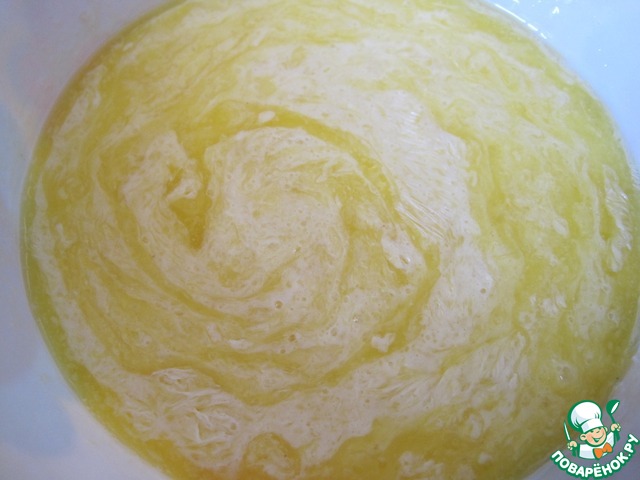 Смешаем молоко, остывшее масло и, слегка-взбитые вилочкой, яйца.