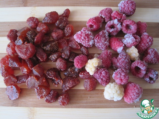Если клубника крупная, то разрежем её пополам. Малину не размораживаем. Вяленую клубнику смешаем с сухими ингредиентами. Замороженную малину смешаем с жидкими составляющими.