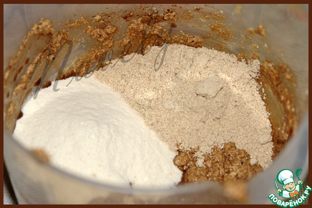 Вторую часть смешать с рисовой мукой, толокном и 1 ч. л. разрыхлителя.