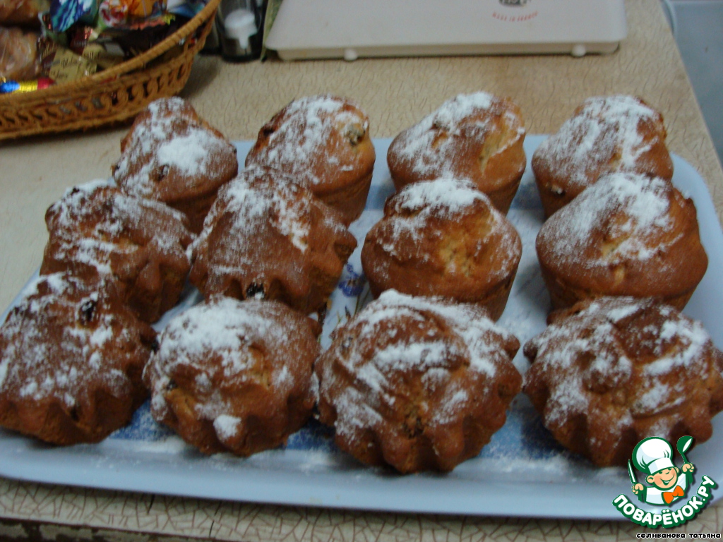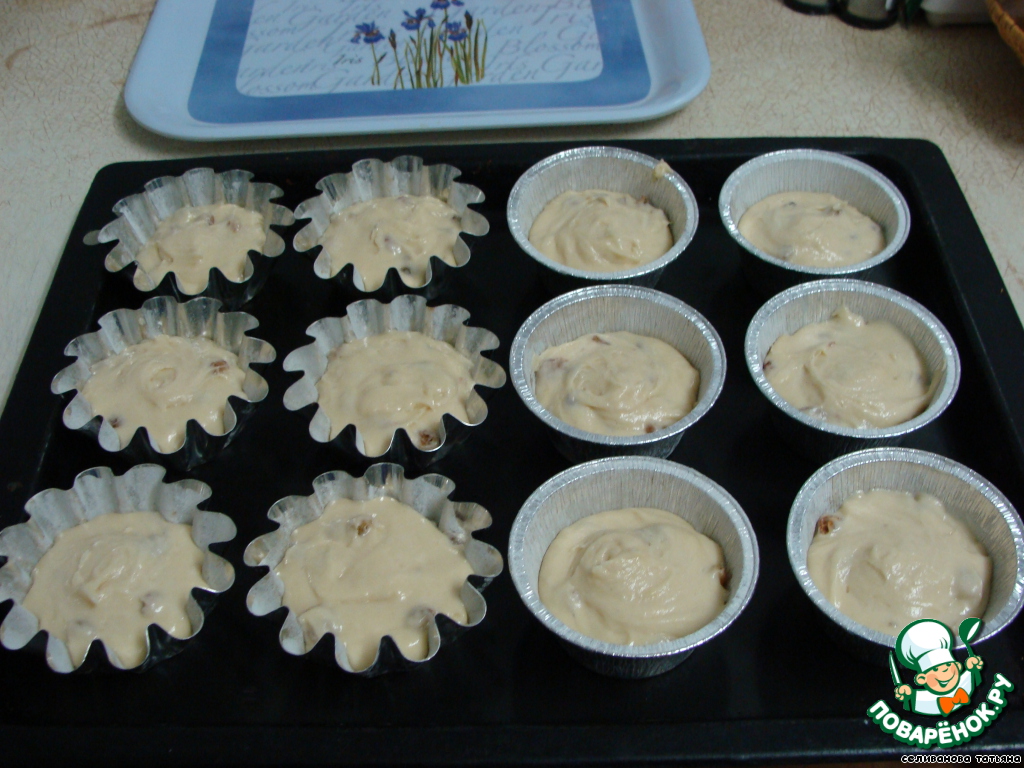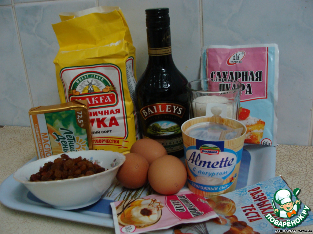 150 г сыра "Альметте" смешать миксером на средней скорости с 150 г мягкого сливочного масла. Добавить 150 г сахарного песка, 8 г ванильного сахара, по одному добавить три яйца, 50 мл сливочного ликера, 10 г разрыхлителя и 250 г муки. Вымесить рукой. Всыпать 100 г изюма (предварительно замочить на 15 минут в кипятке и отжать). Формочки слегка смазать маслом и притрусить мукой. Заполнять на половину объема. Выпекать при температуре 180 градусов 35-40 минут.