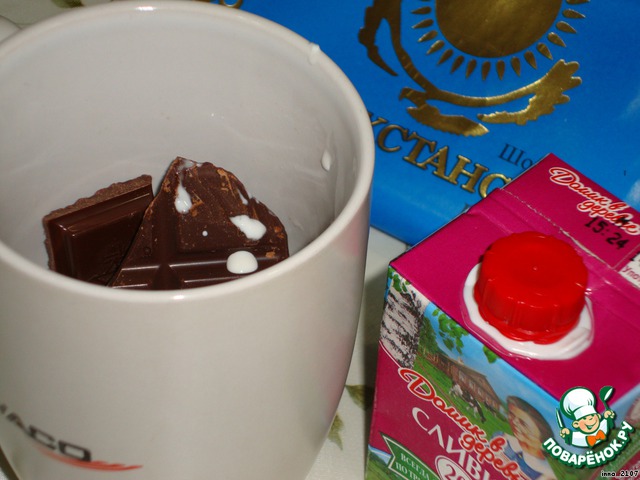 плитку шоколада разломать, влить сливки и растопить в микроволновке. Я растапливала при мощности 800 Вт 40 сек.