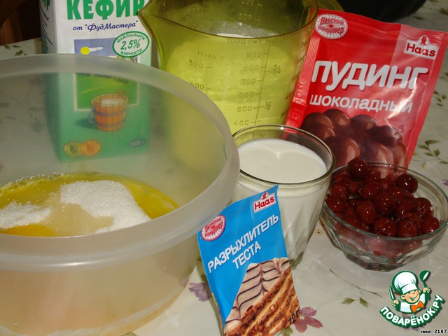 Добавить муку, порошок пудинга, разрыхлитель и кефир.