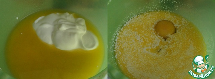 Маргарин растопить, слегка остудить, добавить сметану, перемешать, добавить яйцо, пеермешать.